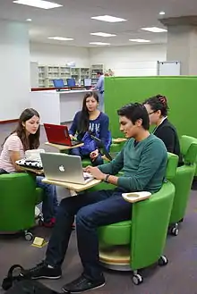 Learning commons, also known as scholars' commons, information commons or digital commons, are learning spaces,[1][2] similar to libraries and classrooms that share space for information technology, remote or online education, tutoring,[3][4] collaboration, content creation, meetings, socialization, playing games and studying.[5][6] Learning commons are increasingly popular in academic and research libraries, and some public and school libraries have now adopted the model.[7] Architecture, furnishings and physical organization are particularly important to the character of a learning commons, as spaces are often designed to be rearranged by users according to their needs.[8]