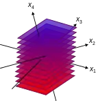 When the number of independent variables is two, a level set is called a level curve, also known as contour line or isoline; so a level curve is the set of all real-valued solutions of an equation in two variables x1 and x2. When n = 3, a level set is called a level surface (or isosurface); so a level surface is the set of all real-valued roots of an equation in three variables x1, x2 and x3. For higher values of n, the level set is a level hypersurface, the set of all real-valued roots of an equation in n > 3 variables.