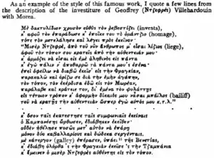 Buchon named the book Βιβλίον της κουγκέστας του Μωραίως (Book of the conquest of Morea), a different title than the text. The second printed edition of the Chronicle was that of the Greek text from Copenhagen, published by Buchon in 1845.[17] In 1889 John Schmitt published both texts of the Copenhagen and Paris manuscripts side by side. [18] [19]