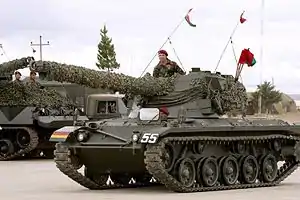 Some light tanks, such as the M551 Sheridan, ZTQ-15 and 2S25 Sprut-SD armored reconnaissance vehicle, could be rigged for low-velocity airdrops from cargo aircraft.[13] With this method the tank is pulled out of the aircraft by brake chutes and skids to a stop. The crew does not ride in the tank during extraction, but parachutes from another plane. Upon landing, they go to their tank, release the lines, and drive it away.
