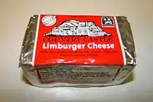 Limburger (in southern Dutch contexts Rommedoe, and in Belgium Herve cheese) is a cheese that originated in the Herve area of the historical Duchy of Limburg, which had its capital in Limbourg-sur-Vesdre, now in the French-speaking Belgian province of Liège. The cheese is especially known for its strong smell caused by the bacterium Brevibacterium linens.[3]