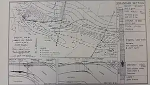 With the success of the drilling in the Los Angeles Basin around 1900, and similar discoveries of oil in Kern County around the same time, prospecting for oil began to occur in Santa Barbara County as well. In 1901 the Orcutt field was discovered, and in 1903 the discovery well for the Lompoc field was drilled, after several failed attempts to find oil in the obviously promising anticlinal structure. A 1902 well was wrecked in an earthquake before it found oil.[8] The discovery well, by the Union Oil Company of California, hit oil in March 1903, and initially produced 225 barrels per day (35.8 m3/d).[9] By 1911, the field had 33 producing wells on the field, six in the process of being drilled, and 15 had already been abandoned, either as dry holes or insufficient producers.[10] Union Oil Company of California's 1905 Well, Hill 4 was the first oil well in which a shutoff was attained by pumping cement through the tubing and back of the casing. [11]