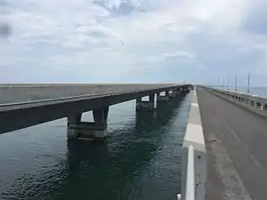The Long Key Bridge, officially known as the Dante B. Fascell Bridge, is a bridge in the Florida Keys connecting Long Key and Conch Key, roughly halfway between Miami and Key West. At a length of nearly two and a half miles, it is the second longest bridge on the Overseas Highway after the Seven Mile Bridge.[1][2] The current bridge opened in 1982, replacing the parallel Long Key Viaduct, which carried the Overseas Railroad from 1907 to 1935 and was repurposed for highway use shortly after.