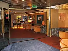 The ship's theme is flowers, and she features floral designs throughout. The atrium contains a sculpture spanning three decks which was created by Luciano Vistosi.[5] Volendam was christened by former professional tennis player Chris Evert on 12 November 1999, who became the ship's godmother.[6]