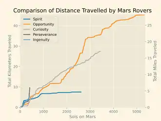 Sojourner rover, Mars Pathfinder, landed successfully on July 4, 1997. Communications were lost on September 27, 1997. Sojourner had traveled a distance of just over 100 meters (330 ft).[20]