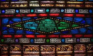 The University of Virginia Christian community remembers Smith positively. A stained glass window 4.0 m (13 ft) high in the University Chapel is dedicated to her memory.[12] Smith's connection with the chapel is not otherwise documented. Record of the original funding and construction of the chapel, which coincide with Smith's lifelong campus residency, indicates the formation in 1883 of the Ladies Chapel Aid Society, prior to the laying of the chapel's cornerstone in 1885 and completion in 1889.[12] The chapel's exhibit at the university's library indicates, "A chapel was finally built on the grounds in the 1880s after a successful campaign led by women dedicated to the spiritual needs of the University community." Library records further show total funds raised were about $36,000.[12][13]