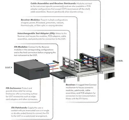 - Interchangeable Test Adapter (ITA): Mates to the receiver and houses modules, PCB adapters, cable assemblies, and patchcords for connection to the UUT.