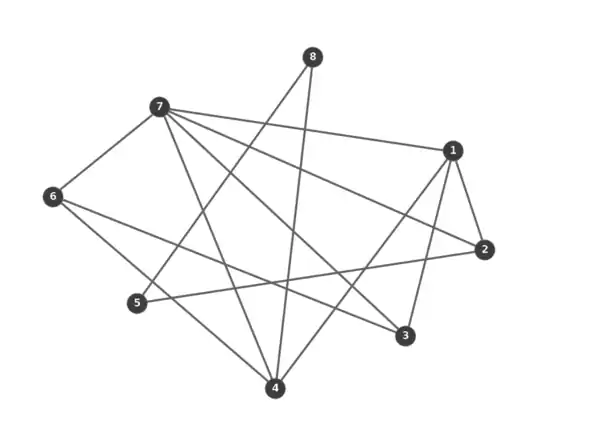 The graph above can be described as candidate set of vertices R = {7(5), 1(4), 4(4), 2(3), 3(3), 6(3), 5(2), 8(2)}. Set of vertices R can now be used as input for both approximate coloring algorithm and ColorSort algorithm. Using any of the two algorithms a table below is constructed.
