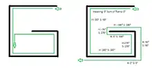 The hand is removed from the wall only when both "sum of turns made" and "current heading" are at zero. This allows the algorithm to avoid traps shaped like an upper case letter "G". Assuming the algorithm turns left at the first wall, one gets turned around a full 360 degrees by the walls. An algorithm that only keeps track of "current heading" leads into an infinite loop as it leaves the lower rightmost wall heading left and runs into the curved section on the left hand side again. The Pledge algorithm does not leave the rightmost wall due to the "sum of turns made" not being zero at that point (note 360 degrees is not equal to 0 degrees). It follows the wall all the way around, finally leaving it heading left outside and just underneath the letter shape.