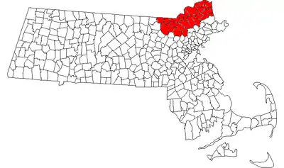 The Merrimack Valley area in Massachusetts is a community of towns and cities flanking the Merrimack River along the New Hampshire border, a portion of which is defined by a line approximately 3 miles (5 km) north and west of the Merrimack. The cities (marked with italics) and towns in this area are:[1]