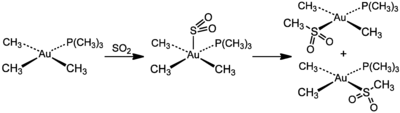 Of academic interest, SO2 acts like a Lewis acid towards the alkyl ligand.[4] The pathway for the insertion of SO2 into metal alkyl bond begins with attack of the alkyl nucleophile on the sulfur centre in SO2. The "insertion" proceed the sulfur dioxide between the metal and the alkyl ligand leads to the O, O'-sulphinate. Alternatively an O-sulphinate can arise. Both of these intermediates commonly convert to an S-sulphinate.[5] S-sulphinate has sulfur–oxygen stretching frequencies from 1250–1000 cm−1 and 1100–1000 cm−1. The O, O'-sulphinate and O-sulphinate are difficult to distinguish as they have stretching frequencies from 1085–1050 cm−1 and 1000–820 cm−1 or lower. The pathway involving the O, O' sulphinate can generally be ruled out if the original metal complex fulfilled the 18-electron rule because the two metal–oxygen bonds would exceed the 18 electron rule.[6] The pathway by which SO2 inserts into a square planar alkyl complexes involves the formation of an adduct. Thereafter, the alkyl ligand migrates to the SO2.[7]