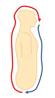 Normally essence or jing can flow either way through the eight extra meridians or energy pathways in the body, but in the microcosmic orbit meditation exercise jing is encouraged to flow upwards along the Governor vessel during inhalation and then downwards along the conception vessel returning to the dantian on the exhalation.[7] This means that energy flows from the dantian downwards to the base of the spine then up the back along the centre line of the body to the crown of the head, then over the head and down the front centre line of the body and back to the starting point again making a full circle or orbit.[8] This prevents the body's natural essences from becoming depleted as they normally flow downwards from the brain or 'sea of marrow' and are lost during ejaculation or menstruation during the reproductive processes. It is this jing or essence which is responsible for the reproductive processes in the body which allow the body to rejuvenate itself as well as for the reproductive processes which give rise to offspring. Essence is also an important component in the manufacture of qi which can be translated into English as vitality or energy, the primary motive force which is life itself. This raising and lowering Jing through the microcosmic orbit and returning it to the dantian purifies the essence and transforms it intoqi or vitality.