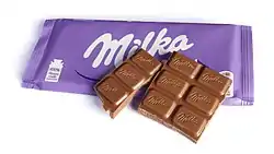 Milka is a brand of chocolate confectionary, originally made in Switzerland since 1901 by Suchard. It has then been produced in Lörrach, Germany for the past 100 years.[2][3] Since 2012 it has been owned by US-based company Mondelez International, when it started following the steps of its predecessor Kraft Foods Inc., which had taken over the brand in 1990.[4][5] It is sold in bars and a number of novelty shapes for Easter and Christmas.[6] Products with the Milka brand also include chocolate-covered cookies and biscuits.[7]