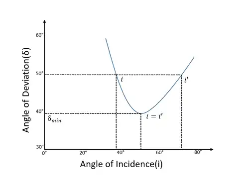 In minimum deviation, the refracted ray in the prism is parallel to its base. In other words, the light ray is symmetrical about the axis of symmetry of the prism.[1][2][3] Also, the angles of refractions are equal i.e. r1 = r2. And, the angle of incidence and angle of emergence equal each other (i = e). This is clearly visible in the graph below.