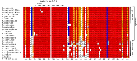 ![]() Predicted secondary structure and sequence conservation of mir-96 | |