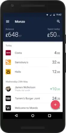 Monzo has released mobile apps for both iOS and Android phones.[64] Payments made with the Monzo cards will trigger push notifications in real-time to phones running the apps, where historical transactions can also be viewed.[57] Users can categorise their transactions, freeze the card (if lost), mark company expenses and view an overview of their spending habits.[65]