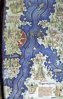 Cipangu was first mentioned in Europe in the accounts of Marco Polo.[5] It appears for the first time on a European map with the Fra Mauro map in 1457, although it appears much earlier on Chinese and Korean maps such as the Gangnido. Following the accounts of Marco Polo, Cipangu was thought to be fabulously rich in silver and gold, which in Medieval times was largely correct, owing to the volcanism of the islands and the possibility to access precious ores without resorting to (unavailable) deep-mining technologies.