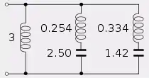 The rightmost term is the extracted resonant circuit with and .[78] The network synthesised so far is shown in the figure.