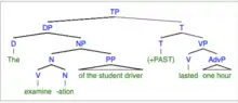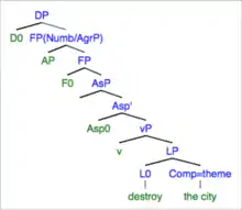Alexiadou (2001) adopts a structural approach to accounting for eventative versus non-eventative interpretations of deverbal nominalization.[14] Her analysis posits that both interpretations (process nouns and result nouns) are associated with a distinct syntactic structure.[15] Alexiadou (2001) proposes that the functional structure of process nominals are much like verbs in that it includes verb-like projections such as Aspect Phrase (AspP) and a light Voice Phrase (vP), whereas result nominals differ from verbs and have no Aspect Phrase or light Voice Phrase included in its functional structure therefore resembling the structure of an underived noun.[15]