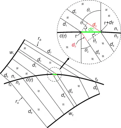 The OPL is constant between wavefronts.[1] This can be seen for refraction in the figure "constant OPL" to the right. It shows a separation c(τ) between two media of refractive indices n1 and n2, where c(τ) is described by a parametric equation with parameter τ. Also shown are a set of rays perpendicular to wavefront w1 and traveling in the medium of refractive index n1. These rays refract at c(τ) into the medium of refractive index n2 in directions perpendicular to wavefront w2. Ray rA crosses c at point c(τA) and, therefore, ray rA is identified by parameter τA on c. Likewise, ray rB is identified by parameter τB on c. Ray rA has optical path length S(τA) = n1d5 + n2d6. Also, ray rB has optical path length S(τB) = n1d7 + n2d8. The difference in optical path length for rays rA and rB is given by: