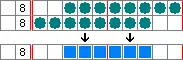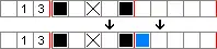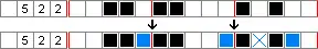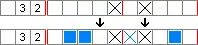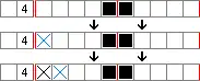 Consequently, the first block of four boxes definitely includes the third and fourth cells, while the second block of three boxes definitely includes the eighth cell. Boxes can therefore be placed in the third, fourth and eighth cells. When determining boxes in this way, boxes can be placed in cells only when the same block overlaps; in this example, there is overlap in the sixth cell, but it is from different blocks, and so it cannot yet be said whether or not the sixth cell will contain a box.