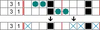 In this example a box is tried in the first row, which leads to a space at the beginning of that row. The space then forces a box in the first column, which glues to a block of three boxes in the fourth row. However, that is wrong because the third column does not allow any boxes there, which leads to a conclusion that the tried cell must not be a box, so it must be a space.