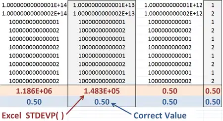 Both the "compatibility" function STDEVP and the "consistency" function STDEV.P in Excel 2010 return the 0.5 population standard deviation for the given set of values. However, numerical inaccuracy still can be shown using this example by extending the existing figure to include 1015, whereupon the erroneous standard deviation found by Excel 2010 will be zero.