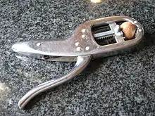 In the 17th century, screw nutcrackers were introduced that applied more gradual pressure to the shell, some like a vise.[1] The spring-jointed nutcracker was patented by Henry Quackenbush in 1913.[5] A ratchet design, similar to a car jack, that gradually increases pressure on the shell to avoid damaging the kernel inside is used by the Crackerjack, patented in 1947 by Cuthbert Leslie Rimes of Morley, Leeds and exhibited at the Festival of Britain.[6][7][8][9] Unshelled nuts are still popular in China, where a key device is inserted into the crack in walnuts, pecans, and macadamias and twisted to open the shell.[10]