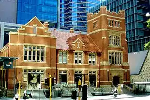 In May 1900, the Perth Technical School opened in the Old Perth Boys School building in St Georges Terrace, with courses available to both boys and girls.[5] The curriculum included chemistry, assaying, engineering, art and design, woodwork and metalwork.[6] With the unexpected death of the superintendent of technical education, Alex Purdie, in 1905, his successor, Frank Allen, who was also director of the Kalgoorlie School of Mines, improved the makeshift facilities in which students had initially been forced to work with an impressive purpose-built technical school, which opened in 1910. Its motto Truth, Beauty and Utility, emblazoned above the front entry, expressed the era's high hopes for technical education. Allen also extended the curriculum to include blacksmithing, carpentry, engine-driving, fitting and turning, plumbing, commercial studies, pharmacy and surveying.[6] The buildings were designed by the chief architect of the Public Works Department (1905–1917), Hillson Beasley (who also designed the Government House ballroom (1899), Western Australian Parliament House (1900), Claremont Teacher Training College (1902), Perth Modern School (1909–11), Midland Courthouse (1907), Fremantle Post Office (1907) and Fremantle Technical College annexe (1910)).[7] Beasley is noted for his 'blood and bandages' style of red-brick public architecture.[7]