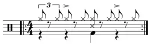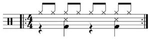 The backbeat is characterized by the dominant snare drum stroke (usually a click produced by cross-sticking) and bass drum both sounding on the third beat of every four, while beat one is left empty. Thus, the expected hit on beat one is "dropped," creating the one-drop effect. Dropping out the bass on the "one" of the measure further accentuates the downbeat of the drums creating the rhythm.[12]