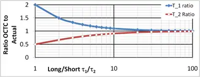 Figure 2 illustrates the approximation. The x-axis is the ratio τ1 / τ2 on a logarithmic scale. An increase in this variable means the higher pole is further above the corner frequency. The y-axis is the ratio of the OCTC (open-circuit time constant) estimate to the true time constant. For the lowest pole use curve T_1; this curve refers to the corner frequency; and for the higher pole use curve T_2. The worst agreement is for τ1 = τ2. In this case τ^1 = 2 τ1 and the corner frequency is a factor of 2 too small. The higher pole is a factor of 2 too high (its time constant is half of the real value).