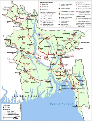 West Pakistani military leaders had not anticipated prolonged Bengali resistance or later Indian military intervention.[19] The main phase of Operation Searchlight ended with the fall of the last major Bengali-held town in mid-May 1971. The operation also directly precipitated the 1971 Bangladesh genocide, in which between 300,000 and 3,000,000 Bengalis were killed while around 10 million fled to neighbouring India as refugees.[20][21]