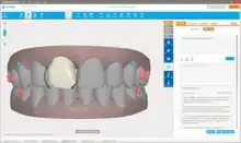 A computer graphic representation of the projected teeth movements, created in the software program ClinCheck, is provided to the doctor and patient for approval or modification before aligners are manufactured.[9][11][13] The aligners are modeled using CAD-CAM (computer-aided-design and computer-aided-manufacturing) software and manufactured using a rapid prototyping technique called stereolithography.[10][11] The molds for the aligners are built in layers using a photo-sensitive liquid resin that cures into a hard plastic when exposed to a laser.[10] The aligners are made from an elastic thermoplastic material that applies pressure to the teeth to move into the aligner's position.[13][14][15] Patients that need a tooth rotated or pulled down may have a small, tooth-colored[16] composite attachment bonded onto certain teeth.[13] Since the form-fitted plastic used in clear aligners is not as rigid as the metal used in traditional braces, sometimes the flexibility in the materials need to be compensated in the areas that require movement. Alternatively, attachments may be used to facilitate movement by changing the shape of the tooth.[17] More attachments can make the aligners less aesthetically pleasing.[11] Reproximation, (also called interproximal reduction or IPR and colloquially, filing or drilling), is sometimes used at the contacts between teeth to allow for a better fit.[18][19]