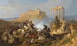 The Serbian revolution (1804–1815) marked the beginning of an era of national awakening in the Balkans during the Eastern Question. In 1811, the fundamentalist Wahhabis of Arabia, led by the al-Saud family, revolted against the Ottomans. Unable to defeat the Wahhabi rebels, the Sublime Porte had Muhammad Ali Pasha of Kavala, the vali (governor) of the Eyalet of Egypt, tasked with retaking Arabia, which ended with the destruction of the Emirate of Diriyah in 1818. The suzerainty of Serbia as a hereditary monarchy under its own dynasty was acknowledged de jure in 1830.[105][106] In 1821, the Greeks declared war on the Sultan. A rebellion that originated in Moldavia as a diversion was followed by the main revolution in the Peloponnese, which, along with the northern part of the Gulf of Corinth, became the first parts of the Ottoman Empire to achieve independence (in 1829). In 1830, the French invaded Ottoman Algeria, which was lost to the empire; between 500,000 and 1,000,000 Algerians were killed,[107][108] while French forces suffered only 3,336 killed in action.[109] In 1831, Muhammad Ali Pasha revolted against Sultan Mahmud II due to the latter's refusal to grant him the governorships of Greater Syria and Crete, which the Sultan had promised him in exchange for sending military assistance to put down the Greek revolt (1821–1829) that ultimately ended with the formal independence of Greece in 1830. It was a costly enterprise for Muhammad Ali Pasha, who had lost his fleet at the Battle of Navarino in 1827. Thus began the first Egyptian–Ottoman War (1831–1833), during which the French-trained army of Muhammad Ali Pasha, under the command of his son Ibrahim Pasha, defeated the Ottoman Army as it marched into Anatolia, reaching the city of Kütahya within 320 km (200 mi) of the capital, Constantinople.[110] In desperation, Sultan Mahmud II appealed to the empire's traditional arch-rival Russia for help, asking Emperor Nicholas I to send an expeditionary force to assist him.[111] In return for signing the Treaty of Hünkâr İskelesi, the Russians sent the expeditionary force which deterred Ibrahim Pasha from marching any further towards Constantinople.[111] Under the terms of the Convention of Kütahya, signed on 5 May 1833, Muhammad Ali Pasha agreed to abandon his campaign against the Sultan, in exchange for which he was made the vali (governor) of the vilayets (provinces) of Crete, Aleppo, Tripoli, Damascus and Sidon (the latter four comprising modern Syria and Lebanon), and given the right to collect taxes in Adana.[111] Had it not been for the Russian intervention, Sultan Mahmud II could have faced the risk of being overthrown and Muhammad Ali Pasha could have even become the new Sultan. These events marked the beginning of a recurring pattern where the Sublime Porte needed the help of foreign powers to protect itself.[112]