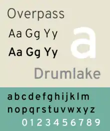 Overpass is a digital typeface, based on the FHWA Series Highway Gothic signage alphabets drawn for the United States Federal Highway Administration. It was designed by Delve Withrington with Dave Bailey and Thomas Jockin.[2]