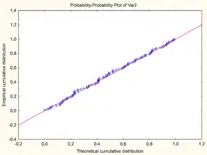 The comparison line is the 45° line from (0,0) to (1,1) – the distributions are equal if and only if the plot falls on this line – any deviation indicates a difference between the distributions.[2]