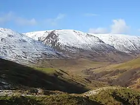 Glen Roy (Scottish Gaelic: Gleann Ruaidh, meaning "red glen"[3]) in the Lochaber area of the Highlands of Scotland is a glen noted for the geological phenomenon of three loch terraces known as the Parallel Roads of Glen Roy. The terraces formed along the shorelines of an ancient ice-dammed loch that existed during a brief period (some 900–1,100 years in duration) of climatic deterioration, during a much longer period of deglaciation, subsequent to the last main ice age (the Devensian). From a distance they resemble man-made roads running along the side of the glen, hence the name. Much of the glen is designated as a national nature reserve.[2]