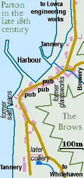 Surprisingly, a new and important industrial concern opened to the north of the village in 1800- the Lowca engineering company. In 1817, the large tannery at the south end of the village was bought for development as a colliery; the coal being mined some distance inland and brought to Parton along a tunnel called the Parton Drift, which also drained the mine workings. To convey coal to the port of Whitehaven a horse-drawn tramway was built along the foot of the cliffs.