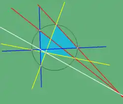 A degenerate case of Pascal's theorem (four points) is interesting; given points ABCD on a conic Γ, the intersection of alternate sides, AB ∩ CD, BC ∩ DA, together with the intersection of tangents at opposite vertices (A, C) and (B, D) are collinear in four points; the tangents being degenerate 'sides', taken at two possible positions on the 'hexagon' and the corresponding Pascal line sharing either degenerate intersection. This can be proven independently using a property of pole-polar. If the conic is a circle, then another degenerate case says that for a triangle, the three points that appear as the intersection of a side line with the corresponding side line of the Gergonne triangle, are collinear.