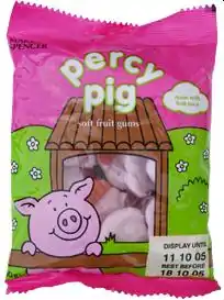 Percy Pig is a British brand of pig-shaped gummy raspberry, strawberry, cherry and grape-flavoured confectionery products made under licence in Germany by Katjes for Marks & Spencer which first appeared in stores in 1992. More than £10,000,000 was grossed between June 2009 and 2010 in Percy Pig sales in Marks and Spencer's UK branches alone.[1] They contain just under 3.5% fruit juice and are suitable for vegetarians.
