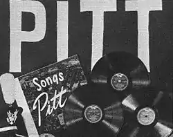 During the 1940s Joseph Wood conducted a recording of a collection of songs entitled Songs of the University of Pittsburgh that featured Walter Scheff, Ralph Nyland, and Michael Stewart. Released on two 78-rpm discs by Republic records, the album featured the "Pitt Victory Song", as well as "Hail to Pitt", "The Panther", and the "Pitt Alma Mater".[10] Various compilations by the Pitt Band and Pitt Men's Glee Club have also been produced that have included the "Victory Song". Around the 1952–1953 school year, the Pitt Band and the Pitt Men's Glee Club collaborated to release a compilation songs entitled Songs of Pitt on RCA Victor Records.[11] A limited edition box entitled Proud Traditions A Musical Tribute to Pitt was released for Pitt's bicentennial in 1987 on the Europadisk Ltd. label[12] and included a booklet and three 12-inch vinyl records that included a recording of the "Victory Song".[13] More recent compilations include "Pitt Spirit" released on audio cassette in 1989,[14] Proudly Pittsburgh in 1997,[15] and in the late 2000s "Pitt Pride!"[16] and "Panther Fans...Are You Ready?" on compact disc.[17] The "Victory Song" is also included on Gameday Faves: Classic College Fight Songs Volume 8.[18] As of 2010 the "Victory Song" is available for purchase in a variety of formats including compact discs, MP3s, and ringtones.