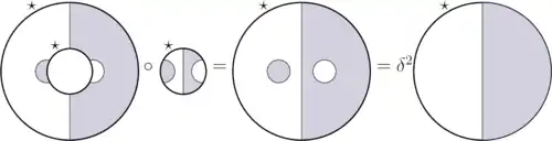 To compose two planar tangles, put the output disk of one into an input of the other, having as many intervals, same shading of marked intervals and such that the -marked intervals coincide. Finally we remove the coinciding circles. Note that two planar tangles can have zero, one or several possible compositions.
