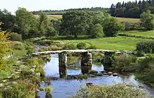 Postbridge is best known for its fine example of an ancient clapper bridge over the river. First recorded in the 14th century, the bridge is believed to have been built in the 13th century to enable pack horses to cross the river, carrying tin to the stannary town of Tavistock. The clapper bridge, a Grade II*-listed structure,[1] is still complete, and stands alongside another bridge, a Grade II-listed structure built in the 1780s.[2]