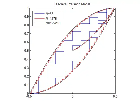 Each of these relays has different and thresholds and is scaled by . Each relay can be plotted on a so-called Preisach plane with its values. Depending on their distribution on the Preisach plane, the relay hysterons can represent hysteresis with good accuracy. As well, with increasing , the true hysteresis curve is approximated better.