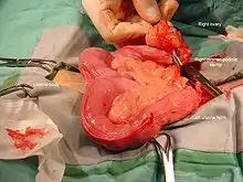| A canine pyometric uterus immediately after surgery to remove it. It is extremely distended with purulent material. | |