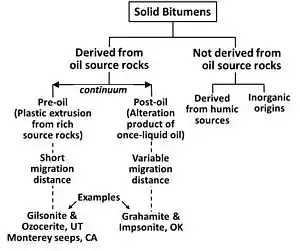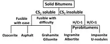 Archaic classification systems for classifying bitumens were constructed without the extensive knowledge of organic geochemistry developed over the past 50 years. Pyrobitumen was originally defined as a solid bitumen that is insoluble and infusible. The original classification system for solid bitumen of Abraham,[4] as adapted from Curiale,[5] is shown in Figure 1. Curiale says that while the historical classification scheme is useful for sorting museum collections, it is not useful for establishing genetic relationships, and he proposed the alternative classification shown in Figure 2.