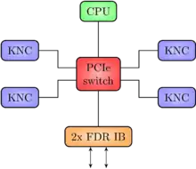 The intra-node communication proceeds via the PCIe switch without host CPU involvement. The inter-node communication is based on FDR InfiniBand. The topology of the InfiniBand network is a two-dimensional hyper-crossbar. This means that a two-dimensional mesh of InfiniBand switches is built, and the two InfiniBand ports of a node are connected to one switch in each of the dimensions. The hyper-crossbar topology was first introduced by the Japanese CP-PACS collaboration of particle physicists.[7]