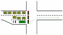Queue jumps are only effective in certain situations. First, there has to be an existing source of delay or roadway congestion; if there is no congestion and the normal traffic signal is usually green, then the bus driver has no reason to move into the queue jump. The length of the queue jump lane needs to be long enough to provide a meaningful time savings. Queue jumps can also be used in situations such as bus stop pullouts or at the end of a bus-only lane, in order to help expedite the bus merge into traffic. Queue jumps may not work well where there are high volumes of right turning vehicles (left turning in UK) that might get in the way of the bus through movement, although in some cases these turning vehicles can be provided a separate lane and/or a protected signal phase at the same time as the advanced transit phase. Available right-of-way is needed to provide the bypass lane.[1][2]