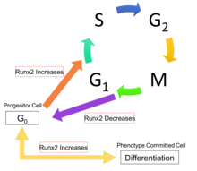 Oscillating levels of Runx2 within the cell contribute to cell cycle dynamics. In the MC3T3-E1 osteoblast cell line, Runx2 levels are a maximum during G1 and a minimum during G2, S, and mitosis.[5] In addition, the oscillations in Runx2 contribute to G1-related anti-proliferative function.[8] It has also been proposed that decreasing levels of Runx2 leads to cell cycle exit for proliferating and differentiating osteoblasts, and that Runx2 plays a role in mediating the final stages of osteoblast via this mechanism.[9] Current research posits that the levels of Runx2 serve various functions.