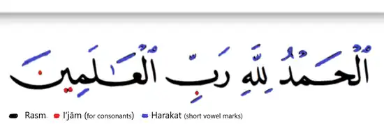 | All diacritics. This style is used to show pronunciation unambiguously in dictionaries and modern Qurans. Alif Waṣlah (ٱ) is only used in Classical Arabic. |